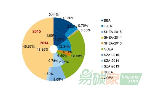 對比7個碳交易試點(diǎn)兩個年度的各自交易情況,如圖3-2,可以發(fā)現(xiàn)變化最大的是廣東碳市場。2015年度廣東碳市場交易總量占全國總交易量的27%,而在2014年度該值僅為6%,份額的來源
