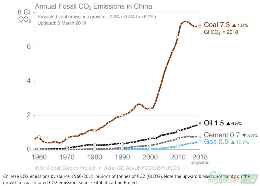 碳排放總量達(dá)100億噸,比2017年增長2.3%(而2017年二氧化碳排放增速為1.7%),其中煤炭消費(fèi)排放為73億噸(+1.0%)、石油消費(fèi)排放15億噸(+6.5%)、