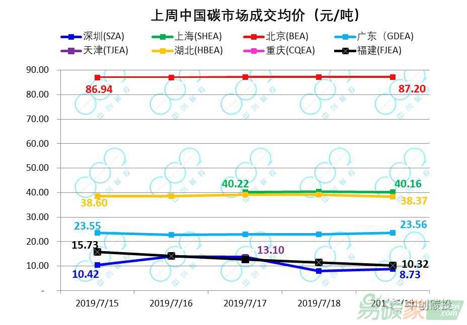 北京試點配額均價最高,達87.11元/噸;上海、湖北次之,成交均價分別為40.21元/噸、38.53元/噸;廣東成交均價22.81元/噸;