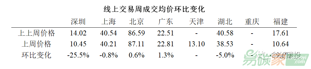 在連續(xù)兩周發(fā)生交易的區(qū)域市場中,福建市場的價格變動幅度較大,較前一周下跌了近40%;深圳市場價格跌幅超過25%。湖北成交均價較前一周略有回落;其他地區(qū)市場價格表現(xiàn)穩(wěn)定,線上交易平均價格與前一周持平。