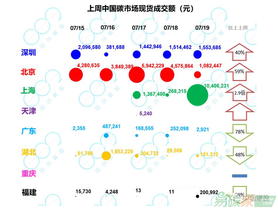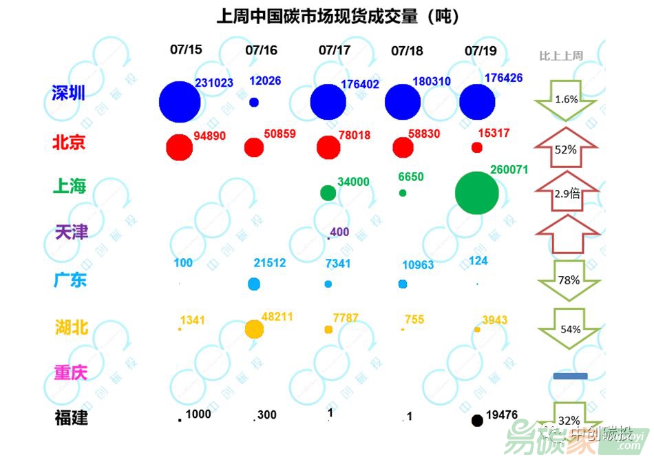 碳市場一、二級配額現(xiàn)貨市場共計成交149.8萬噸,與前一周(143.4萬噸)基本持平,其中深圳的貢獻最大,上周總成交量超過各試點交易總量的50%;總成交額4229.2萬元,均較前一周(3082.0萬元)上漲了37%。