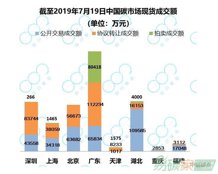 截至2019年7月19日,8個區(qū)域碳市場一、二級現(xiàn)貨市場累計成交3.44億噸,總成交額74.40元。廣東、湖北成交量最高,位于第一梯隊;深圳、上海、北京位于第二梯隊;而天津、重慶、福建的成交量相對較低,位于第三梯隊。