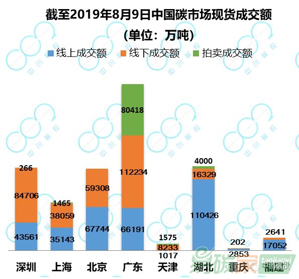截至2019年8月9日,8個(gè)區(qū)域碳市場現(xiàn)貨累計(jì)成交3.47億噸,總成交額75.34億元。廣東、湖北成交量最高,位于第一梯隊(duì);深圳、上海、北京位于第二梯隊(duì);而天津、重慶、福建的成交量相對(duì)較低,位于第三梯隊(duì)。