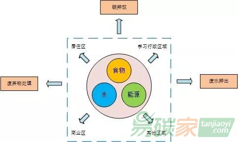碳排放的不同環(huán)境部門(mén)定量分析耦合路徑對(duì)于促進(jìn)區(qū)域尺度下的綜合性可持續(xù)管理至關(guān)重要。大學(xué)自身可被視為小型區(qū)域,它提供了區(qū)域尺度的數(shù)據(jù),并通過(guò)教育、學(xué)術(shù)研究以及財(cái)產(chǎn)運(yùn)作為全球可持續(xù)發(fā)展做出貢獻(xiàn)。本研究基于不同環(huán)境足跡組合構(gòu)建了一個(gè)耦合概念分析框架,并通過(guò)校園運(yùn)營(yíng)和食品采購(gòu)對(duì)小型區(qū)域的水循環(huán)、能源和氣候間的相互作用進(jìn)行評(píng)價(jià)。以英國(guó)基爾大學(xué)(Keele University)為例,2015~2016學(xué)年的總能源足跡、總