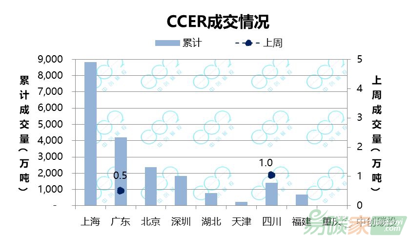 四川、廣東CCER市場發(fā)生交易,累計(jì)成交量分別為10496噸、5000噸。