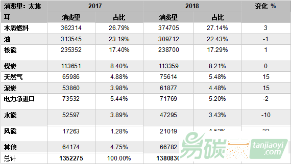 表1 芬蘭2017-2018年度能源消費(fèi)結(jié)構(gòu)