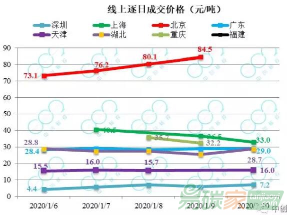 配額成交均價方面,2020年1月6日至1月10日,多個試點碳價“抬頭”,