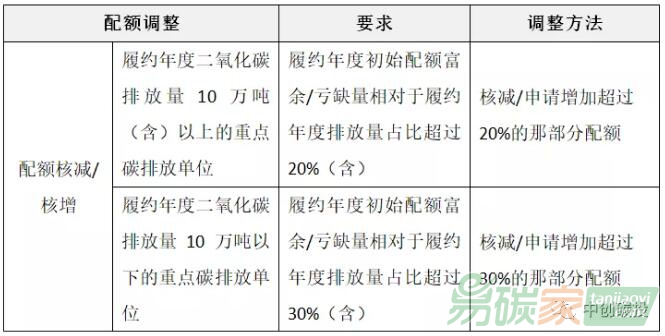 配額調(diào)整分為配額核增和配額核減兩種情況??蛇M行配額調(diào)整的適用范圍進一步擴大,一是對于履約年度已停產(chǎn)的重點碳排放單位或已停產(chǎn)的生產(chǎn)線,不再核發(fā)其配額。二是對于履約年度既有設(shè)施相對于歷史基準年發(fā)生重大變化的重點碳排放單位,應(yīng)調(diào)整該既有設(shè)施在基準年排放量的基礎(chǔ)上核發(fā)配額。三是針對非技術(shù)原因?qū)е碌倪^量配額富缺特殊情況,采用配額調(diào)整機制。(注:此部分在北京市重點碳排放單位配額核定方法正文中。)