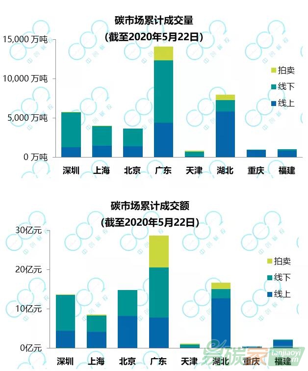 截至2020年5月22日,全國(guó)CCER累計(jì)成交2.2億噸。其中上海CCER累計(jì)成交量持續(xù)領(lǐng)跑,達(dá)9761萬(wàn)噸,占比44%;廣東CCER累計(jì)成交4653萬(wàn)噸,排名第二,占比21%;北京、深圳和