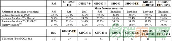 表1 歐盟政策評(píng)估報(bào)告預(yù)測(cè)各種政策組合對(duì)碳