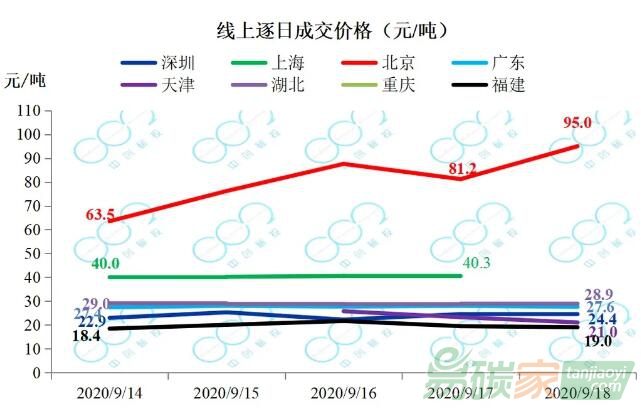 北京碳價在經(jīng)歷上周大幅跌落后,本周逐步回升,至周五達到95元/噸。