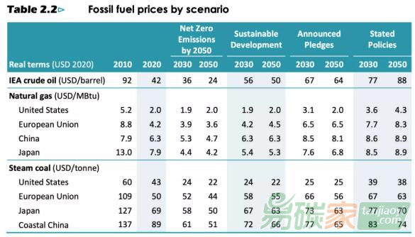 減排措施,2050年不能實(shí)現(xiàn)凈零排放),那么IEA預(yù)測(cè)2050年各類化石能源的價(jià)格是: