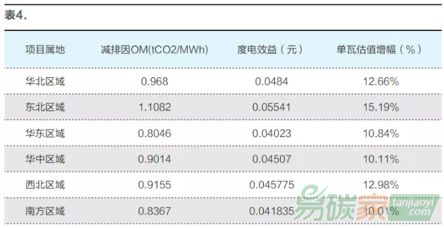 以現(xiàn)期碳交易價(jià)格50元每噸條件下測算,對碳減排度電效益折算到度電效益,并由其度電效益的增加測算其估值增幅,具體測算結(jié)果如表4: