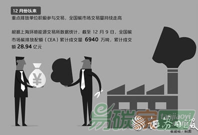 12月份以來(lái),重點(diǎn)排放單位積極參與交易,全國(guó)碳市場(chǎng)交易量持續(xù)走高。根據(jù)上海環(huán)境能源交易所(以下簡(jiǎn)稱“上海環(huán)交所”)數(shù)據(jù)統(tǒng)計(jì),截至12月9日,全國(guó)碳市場(chǎng)碳排放配額(CEA)累計(jì)成交量6940萬(wàn)噸,累計(jì)成交額28.94億元。