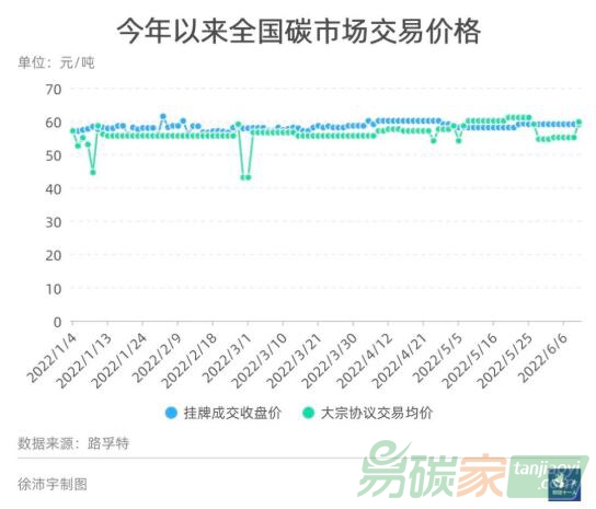 然而,二季度全國(guó)碳市場(chǎng)的交易數(shù)據(jù)更加慘淡。4月、5月,以及6月頭兩周,大多數(shù)交易日的掛牌交易量都只有10噸,4月和5月的大宗交易總量也僅有不足300萬(wàn)噸;交易價(jià)格則保持在55元—60元/噸之間。