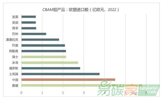 2022年,以貿(mào)易額計,歐盟進口的“CBAM鋁產(chǎn)品”主要來自:挪威、中國、土耳其、俄羅斯、冰島、瑞士、阿聯(lián)酋、印度、莫桑比克、巴林、南非、美國和波黑。在上述13個國家中,挪威、瑞士和冰島因豁免于CBAM應予排除,剩下的就是歐盟進口“CBAM鋁產(chǎn)品”的十大來源。中國仍然排名第一,為45億歐元,占歐盟從中國進口總額的0.7%。
