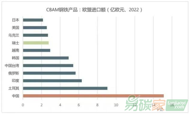 臺灣、韓國、越南、瑞士、烏克蘭、美國和日本。在上述11個國家和地區(qū)中,瑞士因豁免于CBAM應予排除,剩下的就是歐盟進口 “CBAM鋼鐵產(chǎn)品”的十大來源。中國排名第一,為151億歐元,占歐盟從中國進口總額的2.4%。