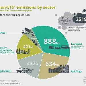 歐盟國家的溫室氣體排放限制是在兩個不同的框架內(nèi)設(shè)定和實施的,即所謂的“碳排放交易體系”(ETS)和“非ETS”部門。2015年非ETS部門排放高達25.19億噸(約占?xì)W洲碳排放的60%),其中交通8.88億噸、建筑6.34億、農(nóng) ... ...