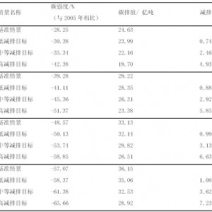 為了分析碳交易機(jī)制對于碳排放的影響,表4 和表5加入了基準(zhǔn)情境下碳排放的情況(BAU 情景)。如表4 所示,低減排目標(biāo)、中等減排目標(biāo)、高減排目標(biāo)約束下,碳強(qiáng)度相對于2005 年水平逐年下降,減排初期為30.38%、35.34% ... ...